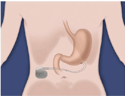 Figure 2: This illustration demonstrates placement of the leads. They are implanted into the greater curvature about 10 cm from the pylorus, 1 cm apart from each other (FDA.gov).