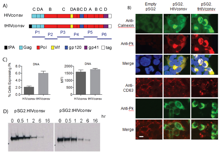 Figure 1: Expression of the HIVconsv immunogen from the pSG2. HIVconsv and pSG2.tHIVconsv DNA vaccines. (A) Schematic diagram of the HIVconsv and tPA-SP-fused tHIVconsv immunogens. T-cell epitope H and mAb Pk tag were attached to the C-terminus of HIVconsv to facilitate pre-clinical development [20]. Letters above the conserved regions indicate the clade, the consensus of which was used, and bars bellow depict the areas of immunogens covered by peptide pools P1-P6. (B) Subcellular localization of the HIVconsv protein (Pk tag). HEK 293T cells were transfected with the pSG2.HIVconsv and pSG2.tHIVconsv vaccine DNAs. Two days later, cells were incubated with chromogenconjugated mAbs specific for the Pk tag (red on the top and green on the bottom panel), calnexinas an ER marker (green) and CD63 as a late endosomal/lysosomal marker (red) to characterize the subcellular localization of HIVconsv immunogen. DAPI was used to visualize the nuclei (blue). Cells were photographed using laser scanning confocal microscopy.Bar, 20 µm. (C) Two days after DNA transfection, HEK 293T cells were lifted from the plates and incubated with FITC-conjugated anti-Pk mAb to detect HIVconsv expression. Percentages of HIVconsvexpressing cells (left) and their MFI (right) were determined using flow cytometry (see Figure 3 for a representative gating). Data are shown as mean ± SEM (n=3). (D) Analysis of the HIVconsv protein half-life in HEK 293T cells transfected with either pSG2.HIVconsv or pSG2. tHIVconsv DNA vaccines. After metabolic labeling with [35S]methionine, cells were chased with cold methionine for the indicated times above the autoradiographs and cell lysates were analyzed by immunoprecipitation using anti-Pk mAb followed by 10% SDS-PAGE and autoradiography.