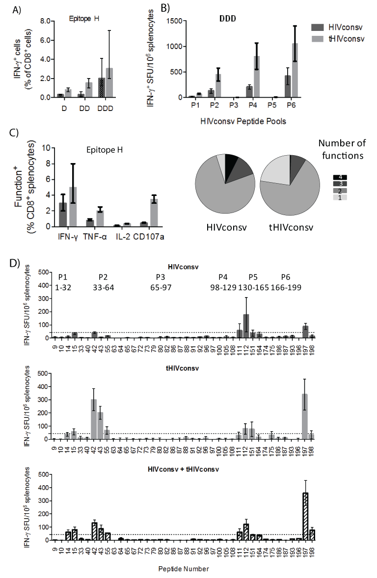 Figure 2: tPA-SP enhances HIVconsv immunogenicity for plasmid DNA delivery. (A) Groups of BALB/c mice were immunized with either pSG2. HIVconsv (dark) or pSG2.tHIVconsv (light) DNA once (D), twice (DD) or three times (DDD) in 7-week intervals and sacrificed 2 weeks after the last immunization. CD8+ T cell induction was assessed in an ICS assay using the optimum H-2d immunodominant peptide H. (B) In a separate experiment, mice received 3 DNA immunizations (DDD) using either the pSG2.HIVconsv (dark) or pSG2.tHIVconsv (light) vaccines. Their HIVconsv-specific T cells were enumerated in an IFN-γ ELISPOT assay employing six peptide pools P1-P6 of 15-mer peptides overlapping by 11 amino acids spanning the entire HIVconsv protein (Figure 1A). (C) Immune splenocytes were analysed using polychromatic flow cytometry for production of IFN-γ, TNF-α, IL-2 and degranulation (CD107a) upon restimulation with epitope H. Percentages of H-specific T cells induced by vaccines expressing HIVconsv (dark) and tHIVconsv (light) are indicated on the left and the T-cell plurifunctionality is shown on the right. See Figure 4E for a representative gating strategy. Data in (A-C) are shown after subtracting no-peptide background as median (interquartile range) (n=5). For the same in vitro restimulations, the HIVconsv and tHIVconsvinduced frequencies of H- or pool-specific T cells were compared using a two-tailed Mann-Whitney U test, whereby asterisk indicates P<0.05. (D) Groups of BALB/c mice received 3 doses of either pSG2.HIVconsv (top), pSG2.tHIVconsv (middle) or half doses of mixed pSG2.HIVconsv+pSG2. tHIVconsv (bottom) as indicated above the graphs and their pooled HIVconsv-specific splenocytes were enumerated against199 individual 15-mers peptides (only peptides with spots in the wells are shown) (n=3). Dotted line indicates the arbitrary threshold for a positive response (at least 50 SFU/106 above the background). Kruskal-Wallis test was used to comparethe three sets of T-cell frequencies induced by the unmodified and tPA-SP-coupled immunogens and their combination (P=0.19).