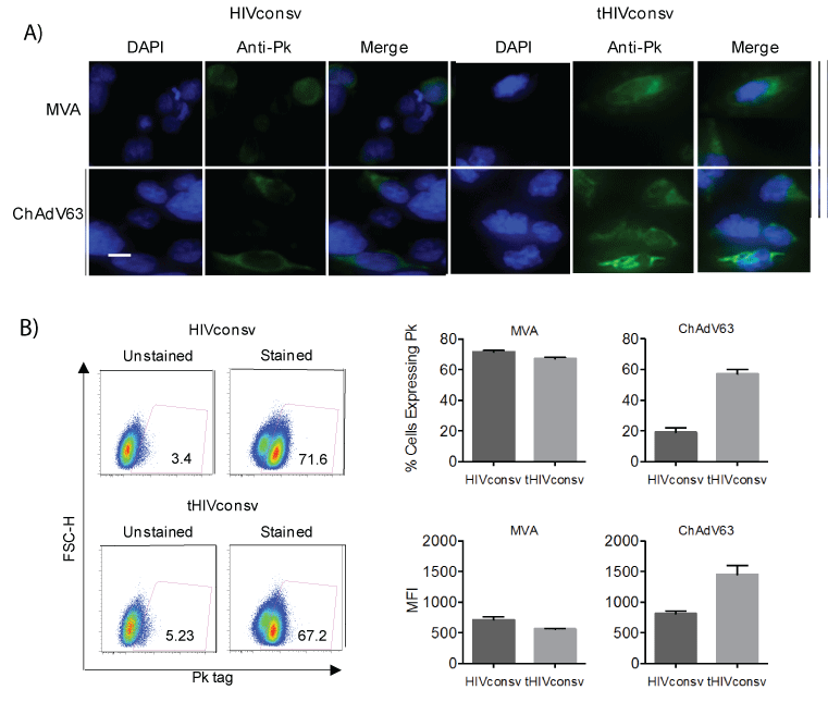 The core of our clinical strategy for delivery of T-cell immunogens consists of simian adenovirus prime and MVA boost. Therefore, genes coding for the HIVconsv and tHIVconsv immunogens were engineered into these two vectors and the vaccines were designated ChAdV63. HIVconsv, ChAdV63.tHIVconsv, MVA.HIVconsv and MVA.tHIVconsv. Similar to the DNA vaccines, the Pk tag expression was confirmed by immunofluorescence using the Pk-specific mAb. Here when using viral vectors, an accumulation of fluorescence in cytoplasmic vesicular structures was more pronounced for the tPA-SP vaccines (Figure 3A). In flow cytometry, the effect of tPA-SP on HIVconsv expression differed in recombinant ChAdV63- and MVA-infected cells. While moderately higher numbers of cells infected with MVA.HIVconsv than MVAtHIVconsv expressed the Pk tag and did so with slightly higher MFI, these parameters were inverted back in favour of the tHIVconsv delivery for the recombinant ChAdV63 infection (Figure 3B). Multiple time points and multiplicities of infection were tested for both viruses and 24 hours post-infection was selected as an optimal compromise between expression levels and cells loosing adherence due to cytopathic effect (not shown). Thus at least at this time point, the effect of tPA-SP addition on the HIVconsv expression differed for the poxvirus and adenovirus vectors.