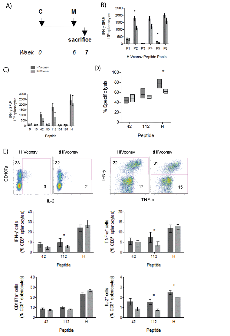 To assess the effect of the tPA-SP on induction of HIVconsv-specific T cells by the ChAdV63-MVA regimen, groups of BALB/c mice were immunized sequentially with the ChAdV63 and MVA vaccines coding either for the HIVconsv or tHIVconsv immunogen (Figure 4A). The IFN-γ ELISPOT assay employing HIVconsv peptide pools P1-P6 detected a less that 2-fold decrease in T-cell frequencies by addition of the tPASP. Decrease in the response magnitude was only significant for pools P2 (P<0.01) and P5 (P<0.03) (Figure 4B). Peptide-stimulated T-cell frequencies showed overall similar trend, which reached significance for peptides 42 (P=0.007) and 112 (P<0.001) (Figure 4C). For the three most immunodominant peptides 42, 112 and H, ex vitro killing assays were performed to determine if the tPA-SP improves CD8+ T-cell lytic activity against peptide-pulsed target cells. While strong lysis at effector to target ratio 10:1 was detected with median killing of between 44% and 77%, statistically stronger killing was only detected for peptide H and this was in favour of the unmodified HIVconsv immunogen (Figure 4D). Next, we assessed whether or not the addition of tPA-SP to the HIVconsv immunogen in the CM regimen affected the expression of IFN-γ, TNF-α and IL-2 by CD8+ T cells. While an approximately 2-fold significant decrease was detected for peptide 112-specific CD8+ T cells producing IFN-γ, TNF-α and IL-2 after tPA-SP attachment, a significantly difference for peptide H was only detected for IL-2 production and no difference for peptide 42 was found for any function (Figure 4E). Thus, for the CM regimen, tPA-SP addition to HIVconsv weakly decreased T-cell induction for some epitopes.