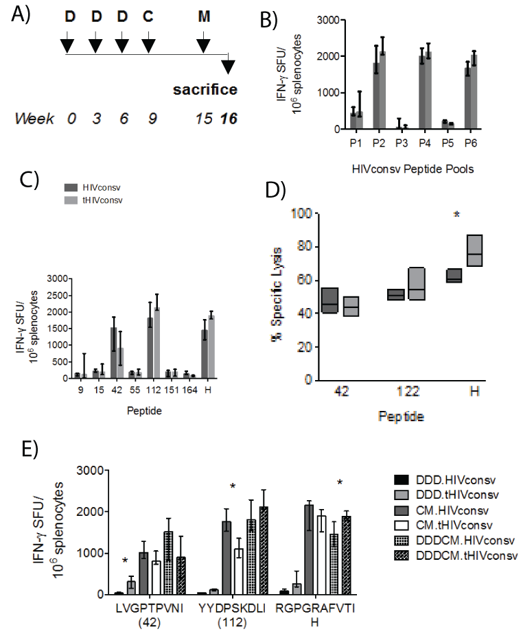 Figure 5: Lack of a consistent effect of the tPA-SP on T-cell induction by HIVconsv in the DNA-DNA-DNA-ChAdV-MVA (DDDCM) regimen. (A) The immunization schedule. (B) Groups of BALB/c mice received either the HIVconsv (dark) or tHIVconsv (light) immunogens delivered by the DDDCM regimen and the frequencies of HIVconsv-specific T cells were assessed in an IFN-γ ELISPOT assay using six peptide pools P1-P6 (B), and individual responding 15-mer peptides and peptide H (C) (n=4). (D) Splenocytes were tested for the ability to lyse P815 target cells pulsed with the two most immunodominant 15-mer peptides and peptide H at effector-to-target ratio 10:1 (n=5). (E) Mice received one of the DDD, CM or DDDCM regimens and the elicited frequencies of T cells specific for the three most immunogenic epitopes were assessed in an IFN-γ ELISPOT assay using the optimal-length peptides (n =3). For all graphs, data are shown after subtracting background as median (interquartile range). The HIVconsv and tHIVconsv-induced T-cell frequencies detected with the same pool/peptide restimulation were compared using two-tailed MannWhitney U tests. Asterisks indicate P<0.05.
