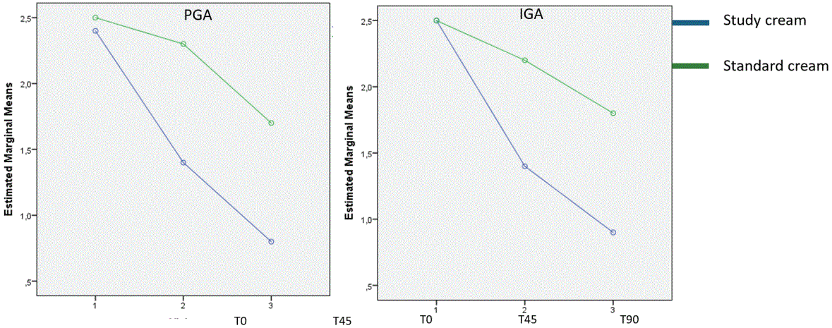 Figure 1: A significantly higher decline in PGA (left image) and IGA (right image) scores in the study cream group, interaction p-value 0.001.