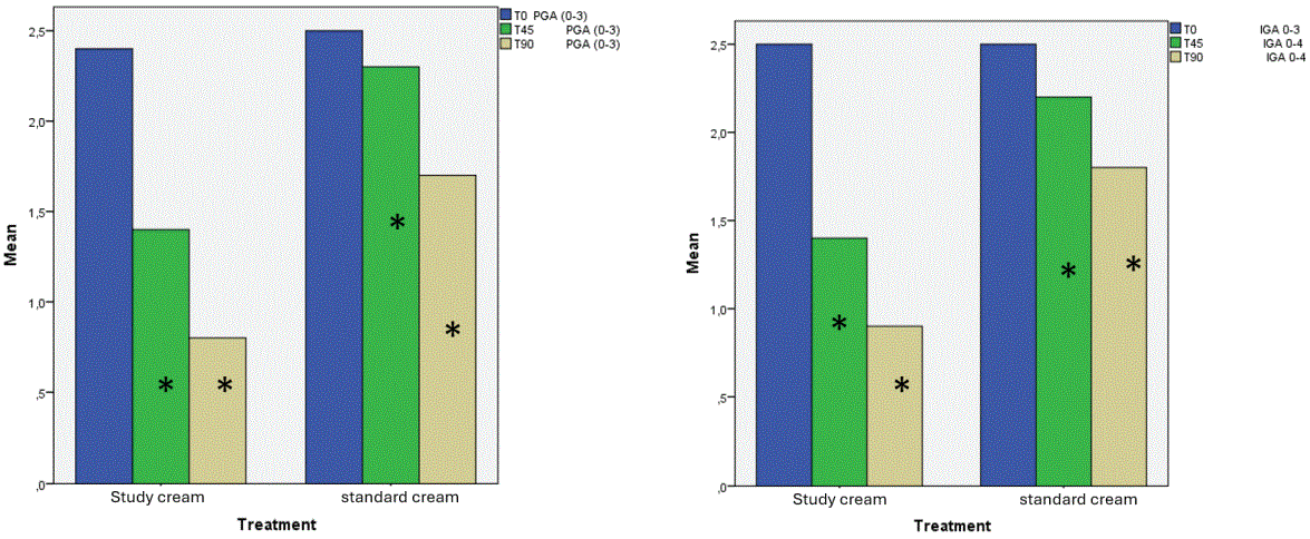 More specifically, the PGA scores showed a significantly greater reduction in the study product, at both T45 (p = 0.026) and T90 (p < 0.001). Similarly, the IGA scores favored the study product, with significant differences at T45 (p = 0.030) and T90 (p = 0.001) (Figure 2). Significant improvement was observed in both scales in both groups along the study. The (*) reflects the significant differences between the study cream group vs. standard cream group.