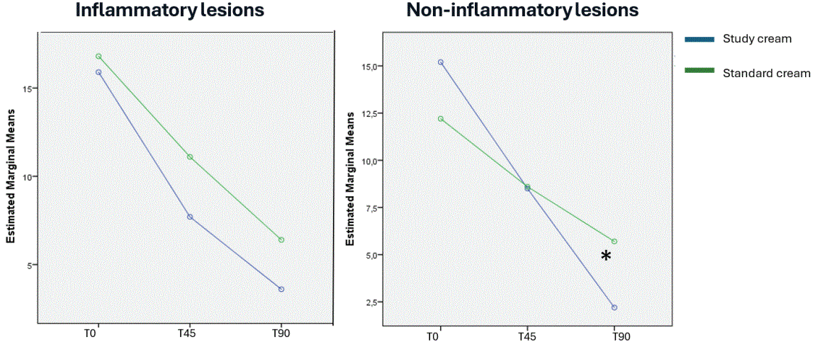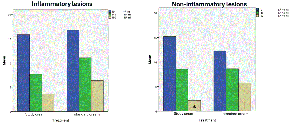 Both groups demonstrated a significant reduction in lesion counts from T45, which was maintained at T90 (p < 0.001). No statistically significant differences were found between groups for either inflammatory (p = 0.337) or non-inflammatory lesions (p = 0.411). However, at T90 the difference in non-inflammatory lesion counts became significant in favor of the study cream (p = 0.04), whereas inflammatory lesion counts remained similar between groups (p = 0.734) (Figure 4). Significant reduction along the time was observed in both groups without significant differences between the study cream group vs. standard cream group, except for the non-inflammatory lesions in T90 (p = 0.04) that were significantly lower in the study cream group.