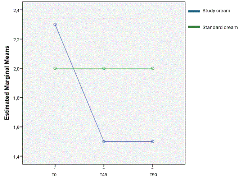 At T90, these percentages reached 60% moderate and 30% intense in the test cream group vs. 40% mild and 60% moderate in the standard cream group. These differences were statistically significant (p = 0.014).