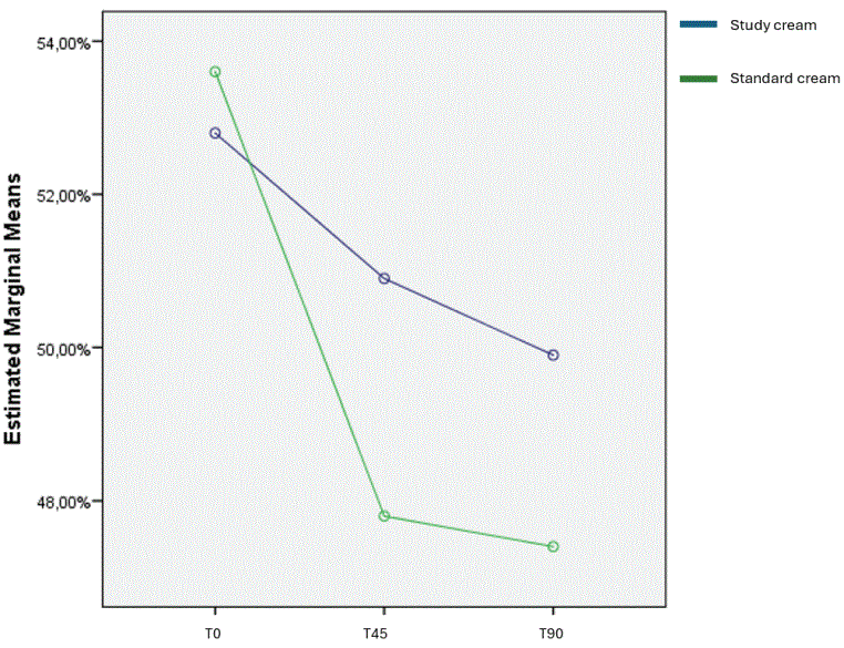 At T45, average hydration decreased from 53% to 51% in the study cream group and from 54% to 48% in the standard cream group. A multivariate analysis of variance (MANOVA) comparing T0 and T45 revealed a significantly greater reduction in hydration in the standard cream group (p = 0.009) (Figure 6).