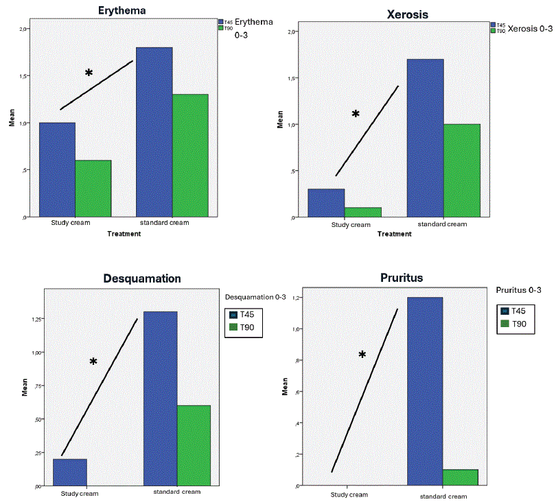 Skin tolerance outcomes favored the study cream, with overall tolerance rated significantly higher compared to the standard cream (p < 0.001). Specific side effects such as erythema, xerosis, desquamation, and pruritus improved significantly from T45 to T90 in both groups, with a significantly greater improvement in the study cream group. These findings are detailed in table 1 and figure 7.