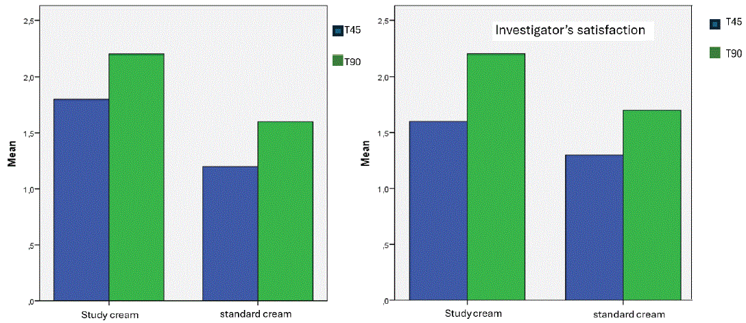 Investigator-assessed improvement also showed significant improvement in both groups at T45 and T90 (p = 0.002). The study cream group tended to score higher improvement ratings, with a trend toward statistical significance when compared to the control group (p = 0.054) (Figure 8).