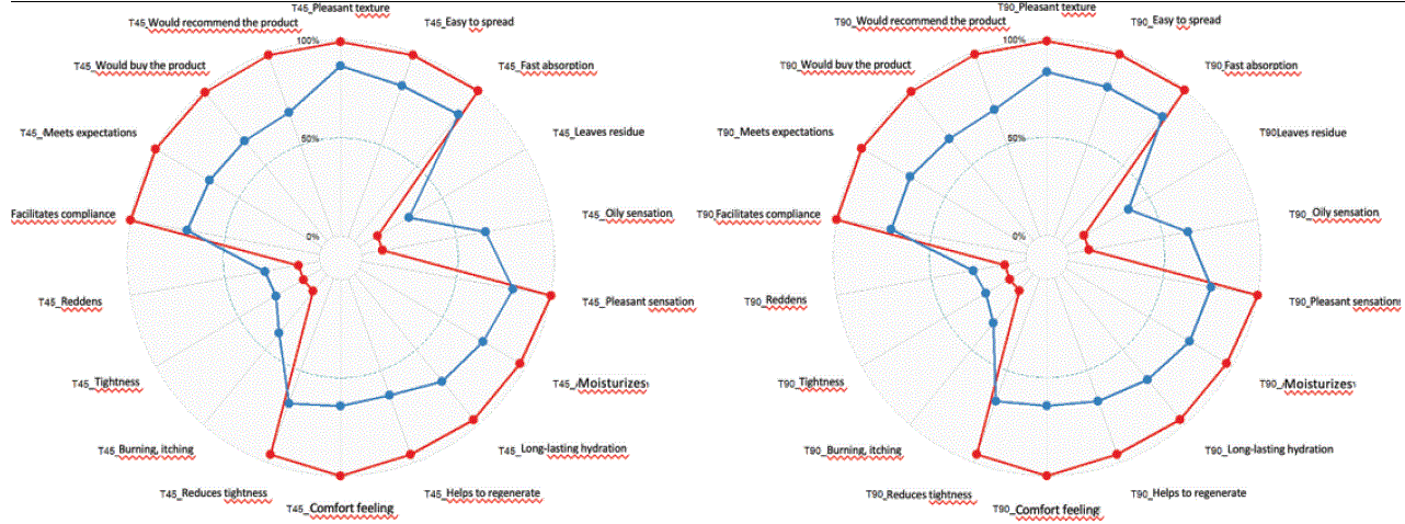 Figure 9: Radar graph shows the better score (p<0.001) reported by patients treated with the study cream (red line) compared to the standard cream (blue line) according to the product test use.