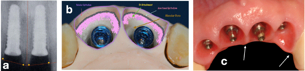 The situation changes when the central incisors are replaced by two adjacent implants (Figures 10a, 10b). In this case, the mesial papilla loses its highest position in the midline, leading to the formation of a "black triangle" that needs to be addressed restoratively. As shown in figure 10a, the distance from the implant platform to the crestal bone is greatest in the center, as illustrated in figure 10a. This significant remodeling will cause the collapse of the middle papilla. Therefore, placing two adjacent dental implants can result in excessive mesiodistal remodeling, which is undesirable [15].