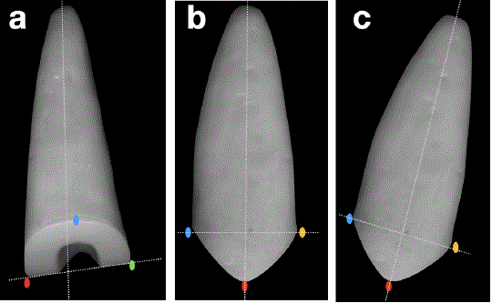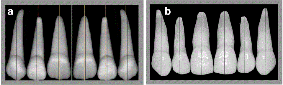 Digital photography was conducted to capture the mesial, distal, facial, and palatal aspects of each carved tooth. The analysis of the images was performed with the teeth oriented parallel to their long axes (Figures 2a, 2b).