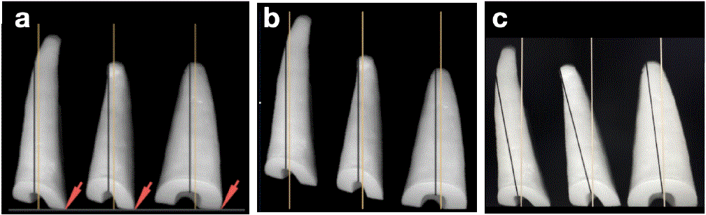 Interproximally, the buccal and palatal aspects were at the same level (Figure 3b). When the root is positioned facial-palatally angled, the facial side is lower than the palatal aspect (Figure 3c).