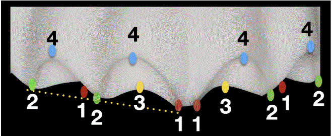 New digital photographs were taken from the mesial, distal, facial, and palatal views. The analysis of these photographs revealed a parabolic shape of the CEJ on both the buccal and palatal surfaces, with an elevation of the CEJ mesially and distally, showing greater height mesially than distally (Figure 3a).