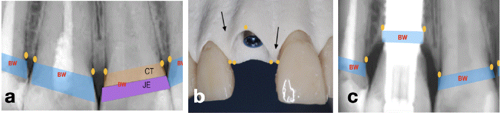 The X-ray (Figure 9a) reveals that the central incisors have the same bone level at the highest point in the midline, with a diagonal slope toward the distal aspect-where the distal surface of the central incisor is higher than the mesial surface of the lateral incisor. The biological width, which includes both connective tissue attachment (CT) and junctional epithelium attachment (JE), follows a similar diagonal pattern.