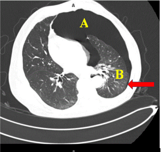 Image C: Simple tomography of the patient's chest where the pneumothorax area can be seen (A), the atelectatic area (B) and the area of the posterior axillary line where the dynamic changes with inspiration - expiration can be observed (arrow) that document the "atelectatic point" described in the text.
