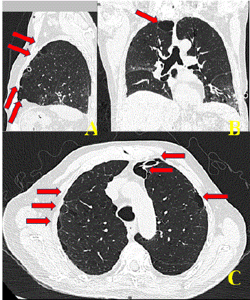 Image D: Simple chest CT study in longitudinal (A), coronal (B) and axial (C) sections where the proper placement of the endopleural tube that resolved the respiratory problem due to pneumothorax is observed and where multiple well-defined hypodense images are observed within the pulmonary parenchyma that corresponds to the bullous disease of small elements (arrows).