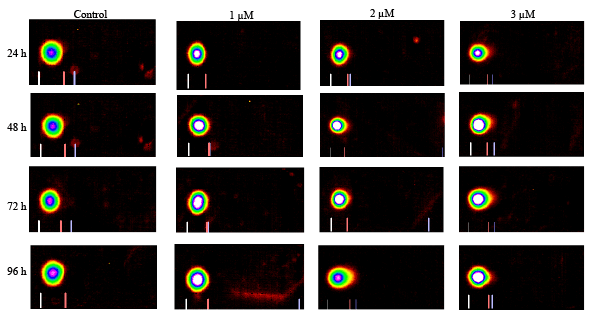 Figure 5: Representative Comet assay images of HL-60 cells exposed to cisplatin 0, 1, 2, or 3 µM for 24, 48, 72, and 96 h. The treated and untreated