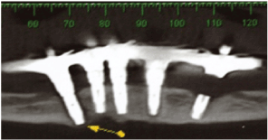 According to the patient, she was rehabilitated with a lower protocol, with 5 implants, 3 years before, after I year of function, there was a distal implant fracture on the left side.The professional responsible for treatment affirmed there would be no need to replace the implant or to conduct repairs on the prosthesis, which had an increase in the distal cantilever.