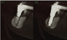 Figure 3: Tomographic cuts of the distal implant where the mandibular fracture can be confirmed without detachment.