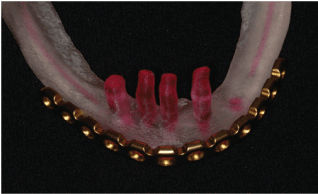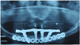 Figure 4: Prototype with the individualized reconstruction plate and the four remaining implants. The linear arrangement of implants compromising rehabilitation biomechanics can be observed.