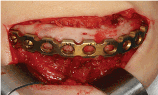 Figure 5: Surgical aspect of the extra-oral access, with the installed plate. In the region anterior to the mandible, screws were not placed to permit installation of the implants.