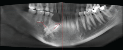 After complete evaluation and orthodontic and periodontic consultation, the surgical treatment plan was set which included surgical removal of the impacted teeth which are the right mandibular lateral incisor (#41) and right mandibular canine (#43) with minimal bone removal as applicable. Associated cyst enucleation and histopathologic examination. Alveolar bone defect augmentation using guided bone regeneration technique. Two dental implants insertion after 4-6 months. Followed by prosthetic rehabilitation.