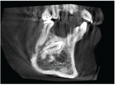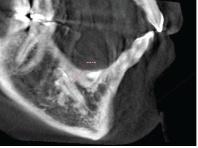 Figure 3: CBCT, sagital view showing impacted mandibular right canine and a unilocular cyst seen below its crown.