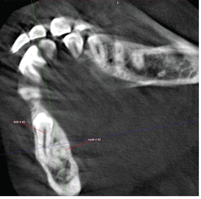 Reformatted cropped panoramic view shows that the right mandibular canine (#43) is impacted and the root is fully formed with dilacerations of the tip of the root, the crown is directed mesially (Figure 2).