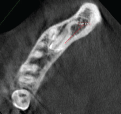 Figure 4: CBCT, sagittal view showing impacted right mandibular lateral incisor the crown directed distally.