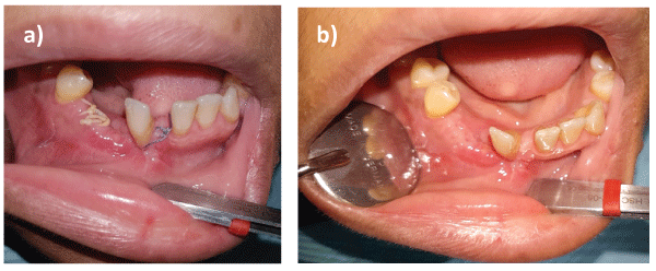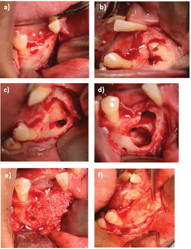 The surgical procedure was done in the usual standard manner under general anesthesia for patient convenience. Sulcular flap incision without vertical release was done. After buccal bone exposure the estimated position of the more superficial tooth which is the canine was pointed out. Canine exposed then removed smoothly. The lateral incisor was located very deep lingual and the two sockets were not connected leading to the need to remove additional bone. The impacted lateral incisor was then removed smoothly after sectioning the tooth. The small cyst located adjacent to them enucleated and the specimen fixed in 10% neutral buffered formalin for histopathologic examination. The resulted bone defect cleaned and repaired with guided bone regeneration using Small Geistlich Bio-Oss® granules (0.25-1 mm granules size) of 1 cc in amount which is a bovine derived xenograft. It was mixed in saline and adapted well to the defect walls then covered with Geistlich Bio-Gide® membrane size: 13 × 25 mm that consists of porcine collagen and has a bi-layer structure. The flap closed in water proof manner to protect the graft materials (Figure 7a-7f). Patient covered with broad spectrum antibiotic which is amoxicillin Clavulanate during the postoperative period for 5 days. During follow up appointments patient showed satisfaction and good healing progress with no signs of infection or wound opening (Figure 8a,8b). A long term follow up was scheduled for the patient and planned for delayed implant insertion after 4-6 months.