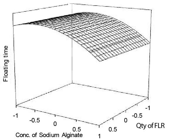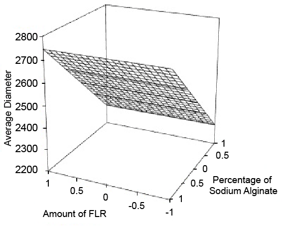 Beads prepared by using 1.0% (w/v) and 1.5% (w/v) sodium alginate solutions showed higher crushing strength ranging from 693 to 917 g probably due to greater bonding of increased strength with increase in concentration of alginate. Higher mechanical strength of beads is important for avoiding breaking and distortion of beads during capsule filling or normal handling especially at the time of large batch production. It is also reflected by the value of coefficient (β2 ), shown in Table 3. The opposite effect of FLR quantity (β1 ) and interaction of it with alginate concentration (β12) on crushing strength of beads may be attributed to increase in bead size with increase in FLR quantity keeping alginate solution concentration constant that probably resulted into weaker and insufficient alginate binding of solid particles (Figure 6). As compared to beads of batch 8 that contained 83.34% FLR out of total powder loaded the beads containing pure FLR showed smaller size and higher mechanical strength. This indicates that size and mechanical strength of beads were not only affected by FLR quantity but also by hydrophobicity of powder loaded in beads. The hydrophobicity of drug probably did not allow stronger bonding between solid particles and alginate that resulted into larger bead size and reduced mechanical strength. The beads of control batch which are devoid of hydrophobic component (drug) probably formed stronger bonds with alginate and hence, produced smaller beads with higher mechanical strength. This is also supported by failure in preparing beads of pure drug.