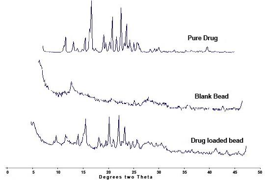 Figure 3: PXRD Analysis of Pure drug (Ranolazine); Blank Beads and drug loaded beads