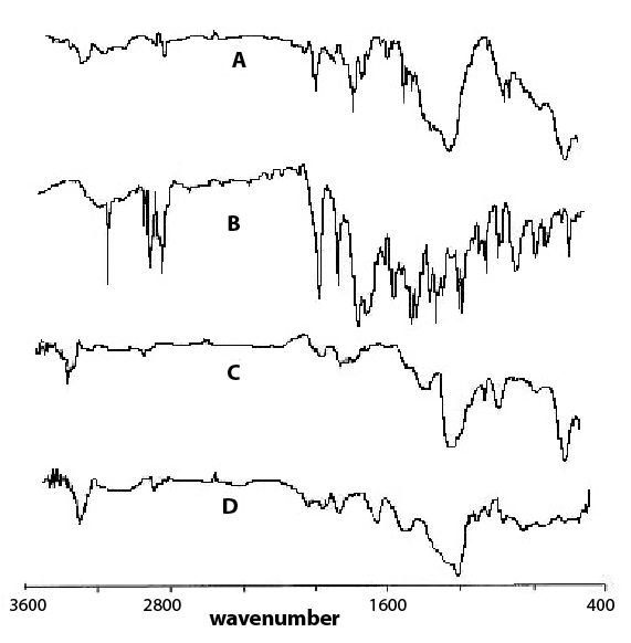 Figure 5: FTIR graphs of A) Drug loaded Beads B) Pure Ranolazine C) FLR D) Sodium alginate