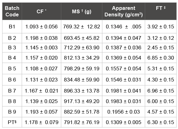 Table 2: Result of different evaluation for beads batches (n=6) * Circulatory factor, † Mechanical strength, ‡ Floating time. § Placebo trial