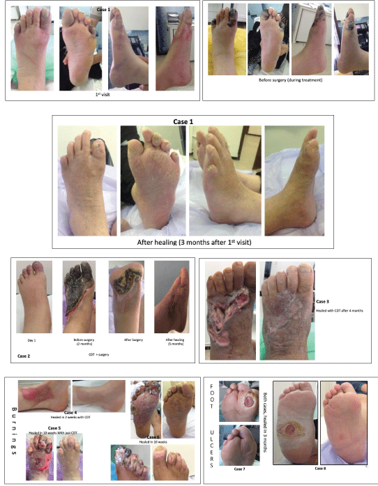 87% of the patients we received did come with an indication to amputate, diagnosed by other surgeons. 30% of the patients did not have wounds. We treated them for diabetic neuropathy including carpal and tarsal tunnel lesions, and arteriopathy. The healing time does not matter for our patients as well as the functional results, but moral comfort is important thus improving their quality of life. Some pictures [Figure 2].