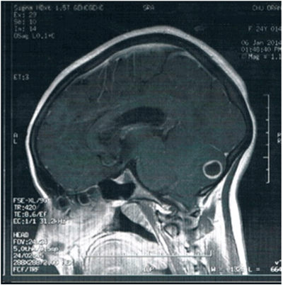 Figure 2:MRI of the head and spine (T2 weighted sagittal view) at time of presentation revealed a T1 hyposignal and hypersignal T2 lesion measuring 13 mm with annular enhancement corresponding to a souscortical postero-median abscess as well as an Arnold-Chiari type 1 malformation with effacement of the citern of posterior fossa and tonsillar herniation in the magnum over 05 mm descending to C2.